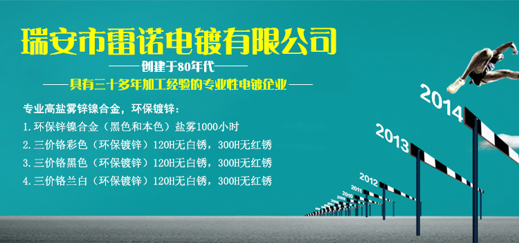 温州瑞安市雷诺电镀有限公司创建于80年代,是一家具有三十多年加工经验的专业性电镀企业;主要业务:电镀盐雾试验、锌镍合金电镀、环保黑锌盐雾试验、环保彩锌盐雾试验、环保兰白盐雾试验、三价铬镀锌电镀、三价铬盐雾试验电镀加工,锌镍合金等;拥有很多设施检测设备(测厚仪和盐雾试验机)和雄厚的技术力量;本厂注重产品质量,不断完善各种检测手段,得到广大用户的一致好评。.....